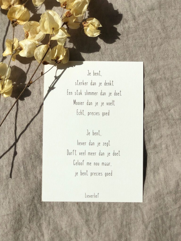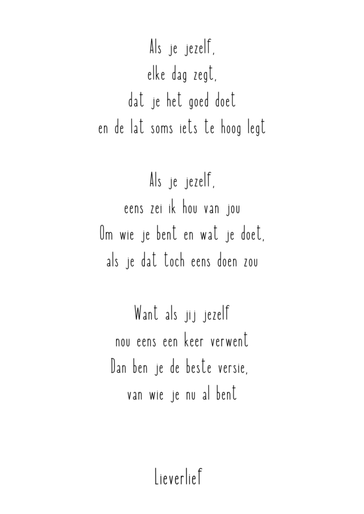Een paar oprechte woorden maken het verschil. Dit gedichtje is perfect voor iemand die altijd maar doorgaat, hoge eisen aan zichzelf stelt of soms vergeet even stil te staan bij wat er al wél is. Dit gedichtje laat zien dat zachtheid ook kracht is.
