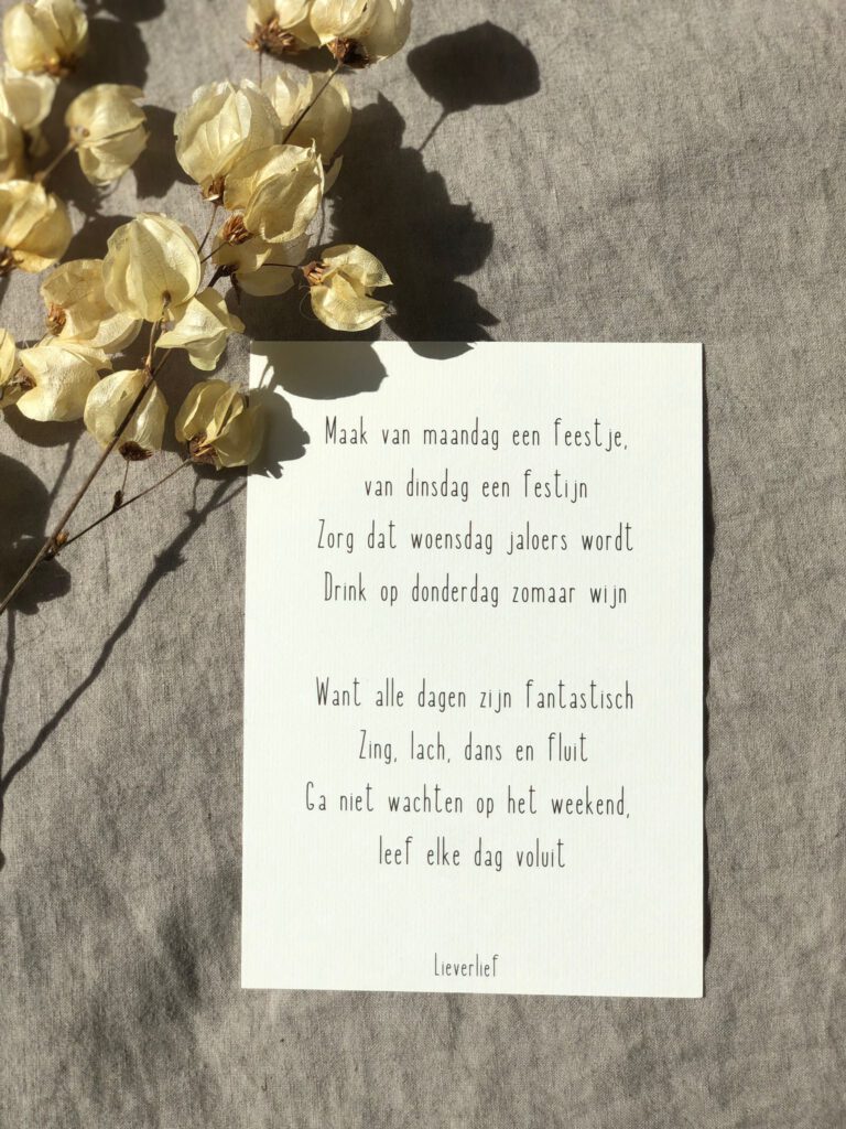 Een kaartje sturen is een klein gebaar met groot effect. Of het nu is om iemand te steunen, te laten glimlachen of gewoon even hoi te zeggen. Woorden op papier blijven hangen. In deze blog lichten we de favoriete rijmpjes van Lieverlief uit en vertellen we de betekenis erachter. Ook geven we een paar creatieve tips hoe je de kaartjes kan gebruiken.