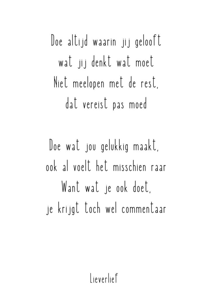 Perfect om iemand dat duwtje in de rug te geven of om je eigen keuzes kracht bij te zetten. Voor iedereen die een sprong waagt, een droom volgt of zijn eigen pad kiest. De tekst zegt eigenlijk: blijf trouw aan jezelf, ook als het spannend is. Juist als het spannend is. Een ideaal kaartje voor ondernemers, studenten of iedereen die iets nieuws begint. En omdat dit rijmpje zo populair is, is deze er niet alleen op kaart. Ontdek alle producten waarop je deze vrolijke tekst leest hier. Kijk gauw welke producten er zijn met de tekst ‘Doe altijd waarin jij gelooft’.